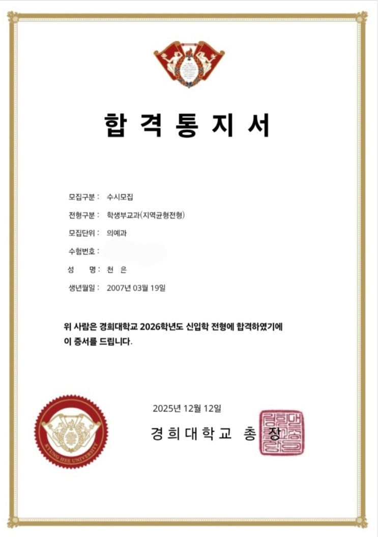 안녕하세요, 리듀영어학원 입니다. 오늘은 그 어느때보다도 기쁜 소식을 들고 왔습니다. 26학년도 경희대 의예과 합격!! 리듀영어는 24년 개원하여 그때의 고2 학생들이 그대로 25학년도 고3 생활을 함께하고, 드디어 26학년도 리듀의 첫 졸업생들을 배출하게 되었습니다. 그 중 리듀영어학원의 최초 학생으로 입학한 학생이 무려 4군데의 의과대학과 카이스트에 합격하는 기염을 토했습니다!! 위 학생은 리듀를 다니면서 서연고2 1학기 + 2학기 + 서연고3 1학기 영어내신 모두 1등급을 받았는데요, 고2,3을 누구보다 성실하게 보낸 것을 지켜봤기에 좋은 결과를 믿어 의심치 않았음에도 합격 소식을 들었을 때는 예상보다도 더 벅찬 감정이 들었....... <img src="https://blogthumb.pstatic.net/MjAyNTEyMTNfMjIg/MDAxNzY1NTYwMjIwMTM0.VvUBLf7k5257nygMH3gE3yrChmmYAX7zuYhAKllEKUUg.dBC0lY4DL8sz3ZIKWmDOumBggN6d4Pr7FyRxSt65P44g.JPEG/KakaoTalk_20251213_020830916.jpg?type=s3" />