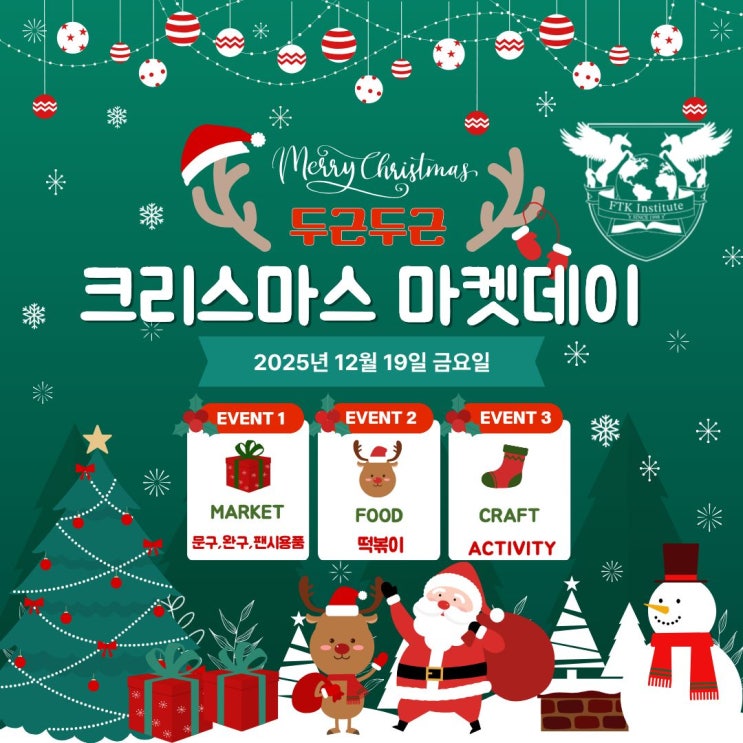 안녕하세요 FTK English 향남캠퍼스 입니다. 다가오는 크리스마스를 맞아 학생들을 위한 특별한 체험 행사, 크리스마스 마켓데이를 진행합니다! 크리스마스 마켓데이 일정 안내 일시 : 2025년 12월 19일 (금) 장소 : 학원 내부 대상 : 재원생 대상 크리스마스 분위기로 꾸며진 학원에서 즐거운 추억 만들수 있도록 하겠습니다. ✨ #향남영어학원 #향남어학원 #향남영어 #향남학원 #영어학원추천 #체험형수업 #크리스마스마켓데이 <img src="https://blogthumb.pstatic.net/MjAyNTEyMThfMTgw/MDAxNzY2MDQ3NTQ0ODc1.83CckX9JHAvLZp3iyCUMrDXMSA1EWh4G2ioKyySFNtcg.OJw5iUa-7DbzI-lqonk4MSC2yChAf4ZqnAV9zqM9HpMg.JPEG/%C1%A6%B8%F1%C0%BB_%C0%D4%B7%C2%C7%D8%C1%D6%BC%BC%BF%E4_%281%29.jpg?type=s3" />