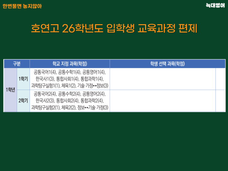 안녕하세요, 한번물면 놓지않는 늑대영어입니다. 오늘은 남동탄에 26년도 개교 예정인 호연고등학교 편제표를 분석해보겠습니다. 편제표는 학생들이 3년간 어떤 수업을 선택해서 듣고 졸업할 지를 보여주는 교육과정 편성표입니다. 편제표를 자세히 들여다보면 학교가 대입을 위해 어떤 계획과 전략을 세우고 있는지를 가늠해 볼 수 있습니다. 1. 1학년 1학년 편제표는 전국의 대부분 일반고가 비슷합니다. 문/이과 구별없이 모두 공통과목을 수강하기 때문에 1학기에는 과목 선택의 유불리는 없습니다. 또한 유일하게 전교생이 모두 같은 과목을 응시하는 1년이기 때문에 등급확보가 2, 3학년에 비해 유리합니다. 그래서 1학년 때는 모든 역량을....... <img src="https://blogthumb.pstatic.net/MjAyNjAyMDNfMjY2/MDAxNzcwMTEyMjcxMzk4.g45fYaX2pvH110e3BJwV3p79B29TT4AB2h6TuJVEJfEg._uq0TpLZZ1SFKxFcZcIllToq3WziTxuACA0Zn_ju68Ug.PNG/%BD%BD%B6%F3%C0%CC%B5%E52.PNG?type=s3" />
