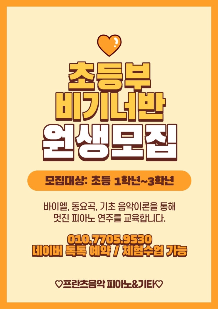 안녕하세요~~! 26년 신학기를 앞두고 " 초등부 바이엘 비기너반 " 원생을 모집하게 되었습니다 아래는 현재 바이엘반 수강하고 있는 학생의 연주입니다 모집 대상: 초등 1학년~3학년 교육 내용: 바이엘 기초 연주, 음악이론 체험수업 신청 가능 문의사항, 체험수업 신청 등은 하단에 기재한 방법으로 연락 주세요! 저희 원은 늘 관심과 사랑으로 아이들 지도하고 있습니다. 감사합니다 상담문의 010-7705-9530 / 네이버 톡톡 예약 <img src="https://blogthumb.pstatic.net/MjAyNjAyMTNfMjMz/MDAxNzcwOTc1NzM1MjM4.D1fiXeKpvktBOgfL0-RHqr4XC1pqggYpNrVxRj7onMsg.3cvSda-zrjZy2ZgqbdRhQbKUhl2t_E147TxINld4Hskg.JPEG/900%A3%DF1770975535253.jpg?type=s3" />