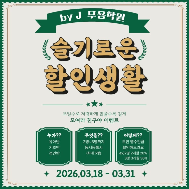바이제이무용학원에서 신규등록 이벤트를 준비했습니다 ♀️친구와 같이 재미있게 무용을 배우면서 체력과 유연성을 길러주세요♥️ ▫️친구,가족과 함께 신규등록시 인원수에 따라 교육비 할인을 해드립니다. ▫️최대 5명 5개월까지 적용됩니다. ▫️이벤트는 모든 수업 대상입니다. 031-846-1278 <img src="https://blogthumb.pstatic.net/MjAyNjAzMTJfMjA5/MDAxNzczMjkzMjc5MDU0.UWj-WD7FS4mFxAV4Crn7CgY4Jl5gEqcapeZoZbcIObog.GgByVQyu7m5qFynELK8xOLuYLZXkMLKk8MzKS0coo_gg.JPEG/IMG%A3%DF8609.JPG?type=s3" />
