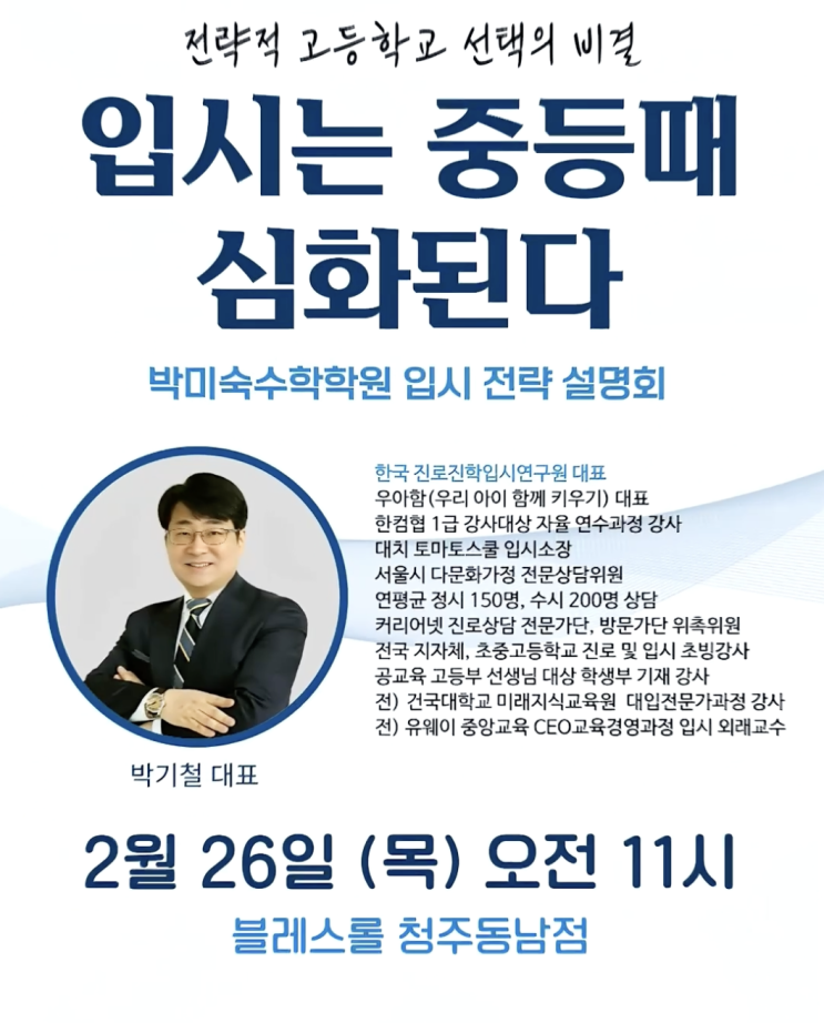 2월 26일(목) 오전 11시 블레스롤 청주동남점 고등학교 선택은 단순한 '학교 선택'이 아닙니다. 어떤 학교를 선택하느냐에 따라 내신 구조, 학생부 방향, 대학 전략까지 달라집니다. 중학생 때 무엇을 알고 준비하느냐에 따라 고등학교 3년의 결과가 달라집니다. 간담회 핵심 내용 ✔️문·이과 선택, 언제 어떻게 결정해야 할까? ✔️탐구력은 어떻게 길러야 하는가? ✔️생기부 관리는 언제부터 준비해야 할까? ✔️고입준비, 무엇을 먼저 시작해야 할까? 막연한 정보가 아닌, 실제 입시 현장에서 검증된 전략을 전달합니다. 강사소개 | 박기철 대표 한국진로진학입시연구원(한진연) 대표 커리어넷 진로상담 전문가단 위촉위원 전국 지....... <img src="https://blogthumb.pstatic.net/MjAyNjAyMjBfMTI0/MDAxNzcxNTc2NzgxODg5.-YgPVjkY3bBN5GCzUvJarYaRIOppTfDO1gmtitwQAHcg.gQMcH7Qnk_L5k6Pmjxcu9-HD5rc3H2NEJRzabRmGInMg.PNG/5%C2%F7.png?type=s3" />