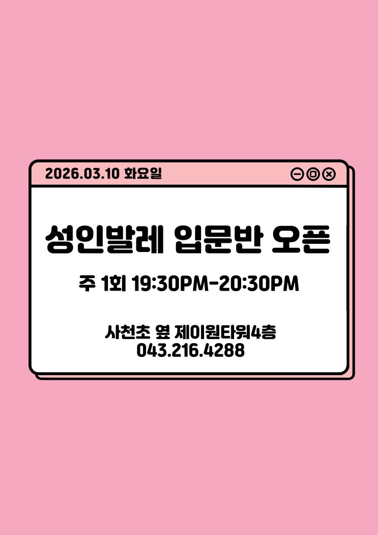 <성인취미발레 입문반, 저녁반 오픈> 3월 10일 화요일 저녁 7시 30분에 시작합니다~^^ 나를 위한 한 시간 하루 종일 앉아있던 몸, 굳어버린 어깨와 허리. 이제는 스트레칭이 아닌 “우아한 운동”으로 풀어보세요 ✨ ✔ 저녁반 운영 (퇴근 후 수강 가능) ✔ 초보자 전용 기초반 ✔ 체형교정 & 라인정리 ✔ 소수정예 수업 발레는 충분히 부드럽고, 생각보다 탄탄합니다 오늘 하루의 피로를 가볍게 정리하는 시간. 무료체험수업 가능 상담문의 DM #사천동성인발레 #율량동성인발레 #내덕동성인발레 #주성동성인발레 #청주성인발레 #성인발레 #성인취미 #사천동성인취미발레 #율량동성인취미발레 #내덕동성인취미발레 #....... <img src="https://blogthumb.pstatic.net/MjAyNjAyMjBfMjA2/MDAxNzcxNTY4MzI2MTU1.Aj4ONoK4iuoNtHoD26n5BihZryY1gJN-gR9ItTD6byEg.ChbHcyHdFW8CUGKo3m_hGC6CwK6wd8v4mxRIZzuT3-Mg.JPEG/%BC%BA%C0%CE_%C0%FA%B3%E1%B9%DD_%BF%C0%C7%C2.jpg?type=s3" />
