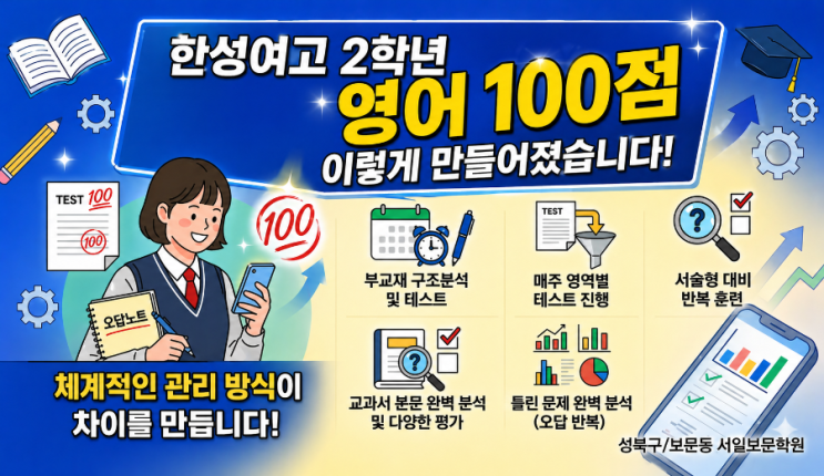 ■한성여고 2학년 1학기 중간고사 영어100점, 1등급은 이렇게 만들어졌습니다. 《26년 한성여고2-1중간고사 100점 학생의 영어시험지 일부》 ※실제 시험지는 학원에서 확인가능! 1.같은 시험을 보고도 누군가는 100점, 누군가는 80점입니다. 왜 그럴까요? 공부량이 아니라 "공부 방식"&"관리 방식"의 차이입니다. ■100점 받은 학생의 공부 방식 2. 영어100점 학생의 공부 방식 이번 한성여고 2학년 중간고사에서 100점을 받은 학생은 공부 방식과 관리 방식이 달랐습니다. *학교 수업 완전 집중! * 매주 영역별 테스트 진행! * 틀린 문제 오답 반드시 정리! * 서술형 대비 다양한 반복 훈련! * 평소가 시험대비 집중 관....... <img src="https://blogthumb.pstatic.net/MjAyNjA0MjZfNzkg/MDAxNzc3MTk3OTMyMDM0.55QSD36BIgRO_4BMkKaG0kFOvyryKhEAb-svKQb5rMwg.hkPwDKzgIzQz6coDzyt282b6VXkP6q9Kqzdkrxy5Jnsg.PNG/900_file_0000000052e871f5b30b6d7b64ddc51e.png?type=s3" />