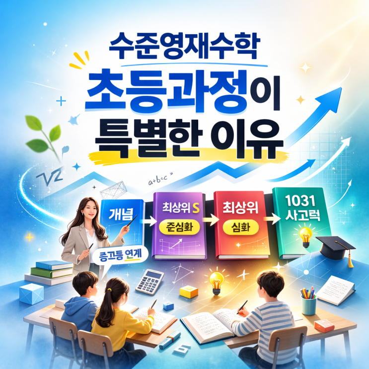 수준영재수학 초등과정이 특별한 이유 초등 수학을 어디서 어떻게 시작하느냐에 따라 중등·고등 수학의 난이도가 완전히 달라집니다. 수준영재수학 초등과정의 강점은 ‘초등만 잘 가르치는 수업’이 아니라, 중·고등까지 막힘없이 이어지도록 설계된 구조에 있습니다. 1️⃣ 개념부터 중·고등까지 이어지는 교과 설계 수준영재수학 초등 과정은 가장 많이 활용되는 검증된 개념 교재를 사용합니다. 중요한 점은, 이 개념 수업을 중·고등을 실제로 가르치는 선생님이 직접 진행한다는 점입니다. 초등만 가르치는 선생님이 아니라, 중·고등 수학의 흐름과 난이도를 정확히 아는 강사가 처음부터 개념을 잡아주기 때문에 이후 과정으로 넘어갈 때 “....... <img src="https://blogthumb.pstatic.net/MjAyNjAyMjVfNTkg/MDAxNzcxOTk1MDI3MDUw.f80jc5nzaXOk38KxjfC0sWrM_KluhzUd8tsb7xDBhYMg.uHJjLmdp8d0sWYN6XBuZ6DVVSZqW6KSCaOiwgl44gAAg.PNG/file_000000009b247208978c2f452f49024a.png?type=s3" />
