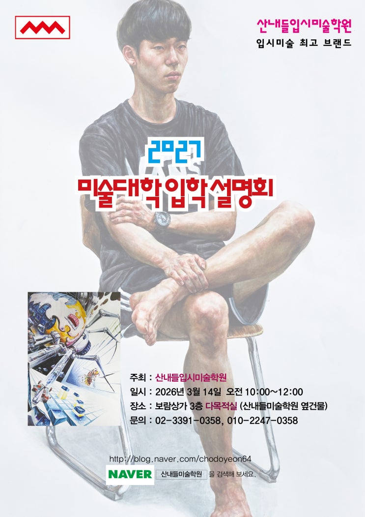 입시설명회 미대입시설명회 주최 : 산내들입시미술학원 일시 : 2026년 3월 14일 토 오전 10시 장소 : 보람상가 3층 다목적실 참석을 희망하시는 분은 02-3391-0358로 신청해 주세요. 2026학년도 입시결과, 진학그림, 진학성적등 공개 2027년도 미대입시 변경사항, 예고입시소개 #입시설명회 #미대입시설명회 #서양화입시 #디자인입시 #미술대학 #예고입시설명회 #노원미술학원 #미술학원 #의정부미술학원 #회화입시 #별내미술학원 <img src="https://blogthumb.pstatic.net/MjAyNjAzMTJfMjM1/MDAxNzczMzE1MjM0MjE0.Dn-UAnrdm4ZUbDAT_3fekrAHjf8OKQ5e0uhrFbRXtN0g.16ul2VpqkpY7ldQe7UKWhsTW8N70da8zAcdE2cDP8qkg.JPEG/%BB%EA%B3%BB%B5%E9%C0%D4%BD%C3%BC%B3%B8%ED%C8%B82026-%BC%F6%C1%A4.jpg?type=s3" />