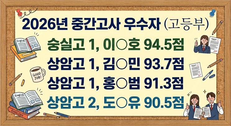 안녕하세요? 은평구 하즈잉글리쉬 하준샘입니다. 생각보다 길게 느껴진 1학기 중간고사 대비가 어제 모두 끝났습니다. 대성고등학교와 선정고등학교 중간고사도 오늘 막을 내렸습니다. 대단원의 마지막은 오늘 들려온 아이들의 성적 소식이었습니다. 잘 본 아이들은 누구랄 것도 없이 먼저 톡을 보내왔어요. 전에 없던 풍경입니다. 그간의 고생이 씻겨 내려가는 순간입니다. 5시간의 직보가 효과가 있었네요. 비록 만점자는 없지만 각자 자신들이 뿌린 노력의 흔적을 엿볼 수 있는 '수확'이어서 나름 만족스럽습니다. 내일부터 3일간의 수련회를 떠나는 대성고 1학년은 물론이고 정상수업으로 복귀하는 선정고와 대성고 2학년까지 충분....... <img src="https://blogthumb.pstatic.net/MjAyNjA0MjhfMTY3/MDAxNzc3Mzg0MTMxNjA2.maDTr7uHeh7R7UwV8kcViartFrcfcm6g8mg4al6MLZYg.pZGv49-n3w0baZ8H0omEcusQ-4IuXRSYfCC1NXtiNu4g.PNG/%C1%A6%B8%F1_%BE%F8%B4%C2_%B5%F0%C0%DA%C0%CE_%281%29.png?type=s3" />