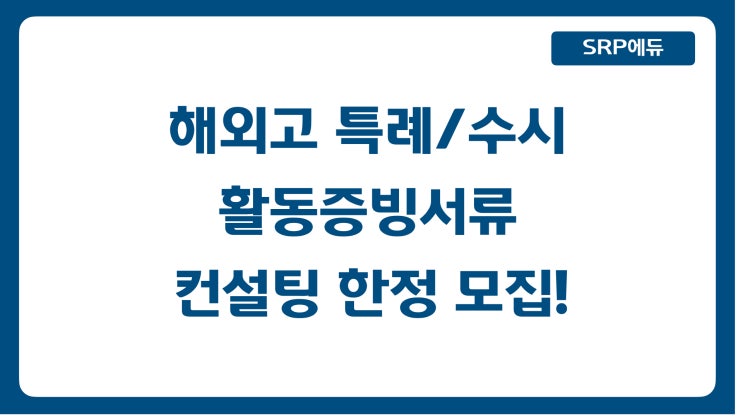 안녕하세요, SRP에듀입니다. 곧 재외국민 특례 / 해외고 수시 전형 접수가 다가오고 있습니다. 지금쯤 IB 파이널, AP 시험 준비로 많이 바쁘실 텐데요. 재외국민 특례는 챙겨야 할 서류들이 특히 많아서 미리 준비하는 것이 중요합니다. 또한 학교별로 활동목록표와 증빙서류 제출 양식이 각기 다르기 때문에 놓치기 쉬운 부분들도 많습니다. 활동증빙서류는 학교에서 직인/사인을 받아야 하는 문서이기 때문에, 졸업·귀국 전에 미리 완성해두는 것이중요합니다. 특히 국제학교 선생님들은 방학 하시면 연락이 잘 안되기 때문에 졸업 전 미리미리 준비해 주세요. 이에 SRP에듀에서 재외국민 특례/해외고 수시 활동서류 컨설팅을 한정 모집합니다....... <img src="https://blogthumb.pstatic.net/MjAyNjA0MjhfMTE2/MDAxNzc3MzQ5NTMxNTkw.hbwdGTBVOORWi0LKnsMWv-Z5k3NTsbxMS32swvS80r4g.UfhyxG1haJCcfnNqrGThjaUQC6tYNTSWBr9C3b1S82cg.JPEG/0428_%C7%D8%BF%DC%B0%ED_%C4%C1%BC%B3%C6%C3.001.jpeg?type=s3" />