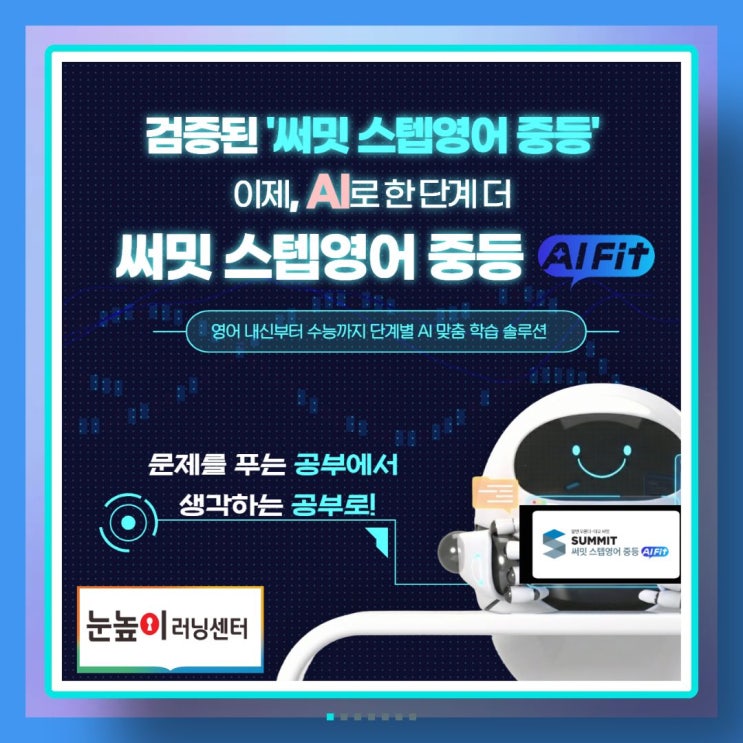 중학생 자녀의 학습에 고민이 많은 실 학부모님께 사고력과 질문력을 바탕으로 자녀의 영어 성적을 상위권으로 이끌어 줄 [써밋 스텝 영어 중등 AI Fit] 을 소개해 드리겠습니다. 중등 내신 영어 성적은 잘 나오지만 새로운 지문의 심화 독해나 사고력을 요하는 수능형 문제를 만나면 당황하고 어려워하는 우리 아이에게 필요한 학습은 무엇일까요? 진짜 상위권으로 가기 위해서는 정답만 찾아내는 기술이 아닌, 스스로 생각하고 질문하는 실력을 키워주는 학습이 필요합니다. 검증된 학습 콘텐츠에 인공지능의 정교함을 더한 [써밋 스텝 영어 중등 AI Fit]으로 중학생 자녀의 진짜 영어 실력을 키워주세요. 이제는 'AI Fit'으로 한 단....... <img src="https://blogthumb.pstatic.net/MjAyNjAyMThfMjY5/MDAxNzcxNDE2Mjk3OTU2.UzSMqOh6AxK9L47g0Mllhwl8bjKI5rmbb7T0SHuga_gg.RGPV113nHPMEK7szfeapMpOnFBNHYxMyf2l9OKYqHawg.JPEG/KakaoTalk_20260218_205138934.jpg?type=s3" />