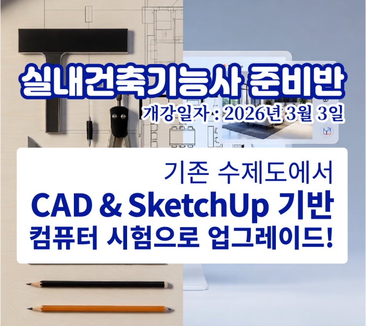 AutoCAD · SketchUp으로 준비하세요 (2026 대비) 실내건축기능사 실기시험은 도면을 정확하게 이해하고 표현하는 능력이 중요합니다. 이에 맞춰 실기 준비 과정 역시 CAD 기반 도면 작성과 공간 이해 중심으로 변화하고 있습니다. 준CAD학원에서는 AutoCAD와 SketchUp을 활용한 실기 대비 과정을 통해 자격증 대비와 함께 실무 활용까지 동시에 준비할 수 있도록 교육을 진행합니다. 이런 분들께 추천합니다~! 실내건축기능사 실기 합격이 목표인 분 CAD·SketchUp을 처음 접하는 비전공자 전공자이지만 실기 대비가 필요한 분 자격증과 CAD 실무를 함께 준비하고 싶은 분 직장인·재직자 등 저녁 수업을 찾는 분 수업 시간 & 운영 방식 주 3일....... <img src="https://blogthumb.pstatic.net/MjAyNjAyMTRfMTU4/MDAxNzcxMDA1MTA0MzA5.7GLZpftuy9ZCm4D0_m-FXj0p880NIIC-tqP7E1lqhTgg._bHqMdcPTMldiclzp2CbbfjHNXXGBS58O_dRpPHofVgg.JPEG/%BD%C7%B3%BB%B0%C7%C3%E0%B1%E2%B4%C9%BB%E7_%B9%E8%B3%CA2.jpg?type=s3" />