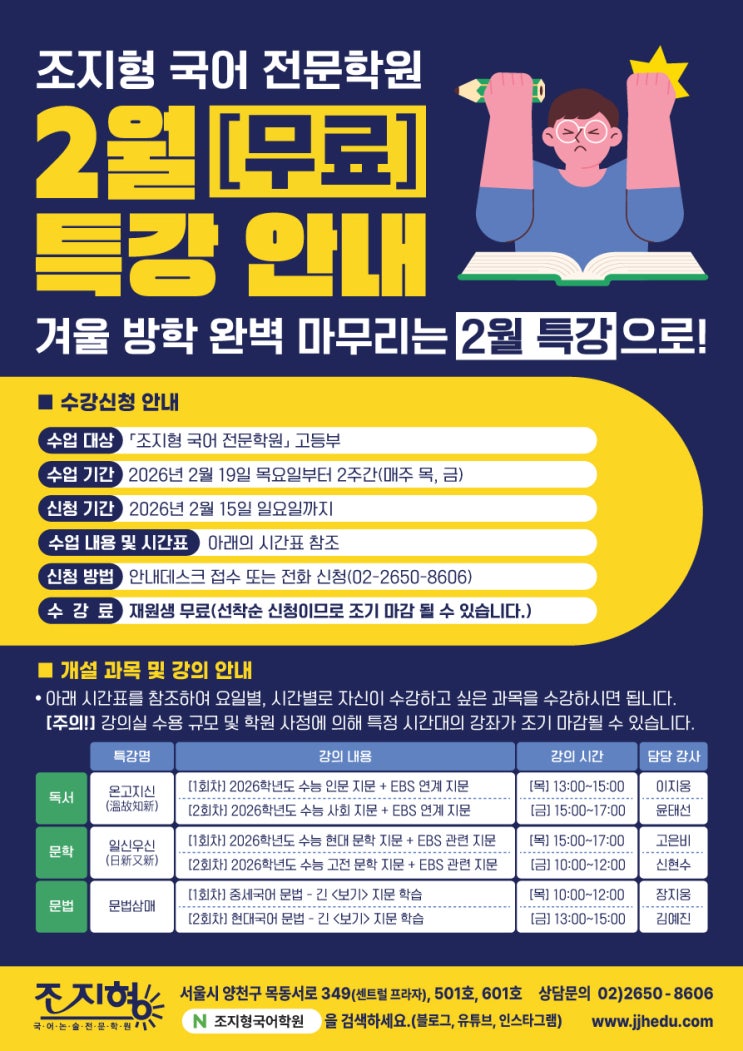 안녕하세요. 조지형 국어학원입니다. 어느덧 겨울방학도 반환점을 돌아 후반기로 접어들고 있습니다. 어떤가요? 방학이 시작될 때의 굳은 결심이 잘 유지되고 있나요? 한겨울의 추위를 녹여버릴 여러분의 뜨거운 열정을 응원합니다. 조지형 국어학원에서 정성스레 준비한 2월 무료 특강 프로그램을 소개합니다! 기간은 26년 2월 19일부터 2주간 진행됩니다. 이번 특강은 지난 1월 특강과 달리 무료로 진행됩니다.(재원생에게만 주어지는 혜택!) 조지형 국어학원에 재원 중인 학생은 빠짐없이 신청하시고 겨울 방학을 보람있게 마무리하시기 바랍니다. 포스터의 내용을 참고하시어 신청하시기 바랍니다. 수업을 통해서도 안내문이 배포될 예정입니....... <img src="https://blogthumb.pstatic.net/MjAyNjAxMjNfMjYx/MDAxNzY5MTYwMjkxNTQ5.36RN-nM-3PbzoXAKFo9rXgWoY2cCMmWdFVyDG4Jze0Mg.WkmqraGwd-5bb2Cid7rTPaSpvA8nIYdvazW0910e6qAg.JPEG/26%B3%E2_2%BF%F9_%C6%AF%B0%AD.jpg?type=s3" />