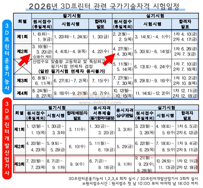 다음주는 3D프린터운용기능사 필기 접수기간입니다! !(3D프린터운용기능사 일정 및 국비지원 과정 개강 안내) 안녕하세요 쓰리디프린팅교육학원 / 4D메이커스입니다 그 동안 추워서 혼났는데, 벌써 따뜻한 바람이 부는 3월 입니다^^ 2026년에도 변함없이 3D프린터운용기능사 시험이 있는데요~ 2026년 2회차 필기 시험이 4월, 실기시험은 6월에 있어요 3D프린터운용기능사 시험은 국가기술 자격시험인데요 다들 국가기술 자격시험이라 어렵게 생각하시는데요 그냥 3D프린터교육학원에서 기초과정 정도의 수준을 이수하시면 충분히 합격가능해요.. 왜냐하면 쓰리디프린팅교육학원은 더 어려운 제품을 많이 만들기 떄문에^^ 사실 기능사 시험은 쉽습....... <img src="https://blogthumb.pstatic.net/MjAyNjAzMTBfMTMy/MDAxNzczMTI5MDA2OTQx.2u0nY37o5VnDRQi5jIUjWb6anXYF-GuL1F0pXDLcNesg.pRQ6TQ2vTDyWTgOahu3MkcIu0jnhzreRAPzQP-ZwMVIg.JPEG/3D%C7%C1%B8%B0%C5%CD%BF%EE%BF%EB%B1%E2%B4%C9%BB%E7%BD%C3%C7%E8%C0%CF%C1%A4%B9%D73D%C7%C1%B8%B0%C5%CD%C7%D0%BF%F801.JPG?type=s3" />