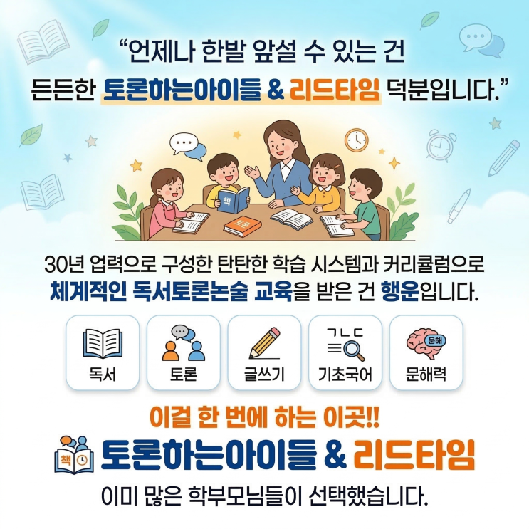 독서논술 창업 성공 예감!! 본사의 교수 역량 강화 교육 본사의 경영 컨설팅, 마케팅 지원 본사와 원활한 소통으로 교육과 사업 모두 성공!! 새 학년, 새 학기는 교육 사업 창업에 있어 가장 좋은 기회입니다. 이 시기 학부모와 학생들은 변화하는 교육 과정과 평가 방식에 대한 불안 속에서 새로운 대안을 적극적으로 찾습니다. 즉, 준비된 창업자에게는 이미 수요가 형성된 시장입니다. 현재 교육 흐름은 분명합니다. 수행평가 비중이 40~60%까지 확대되며 성적을 좌우하고, 초중고 시험은 논서술형 중심으로 빠르게 변화하고 있습니다. 단순 암기식 공부로는 더 이상 경쟁력을 갖기 어렵습니다. 여기에 문해력 부족 문제까지 더해지며 국어뿐....... <img src="https://blogthumb.pstatic.net/MjAyNjAzMjFfMTE3/MDAxNzc0MDY3MjMyNjU5.hMfZipNYpqSe7tPNqy88hm-sH8-aWbEcyvqOPd6P4n0g.1t7swh9c-ZDg1o9e_GU9whAuUPw0kf967ZuhiiXQjoYg.PNG/00000000000000000000000000_%282%29.png?type=s3" />
