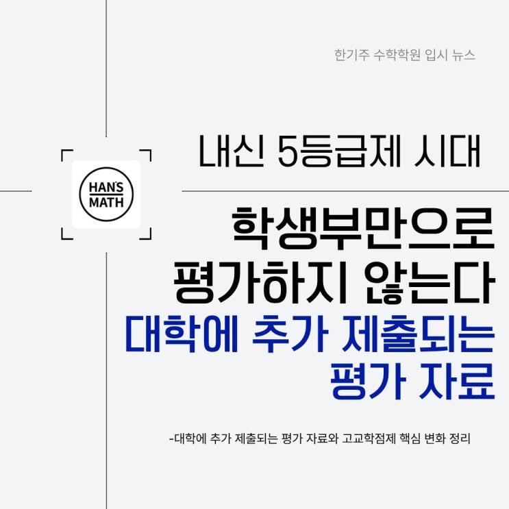 안녕하세요~ 언제나 정성을 다하는 30년 수학교육 전문 한기주 수학학원입니다! [대학에 추가 제출되는 평가 자료] 내신 5등급제 시대, 학생부만으로 평가하지 않는다 대학에 추가 제출되는 평가자료와 고교학점제 핵심 변화 정리 안녕하세요 한기주 수학학원 입니다. 최근 고등학교 교육과 대학 입시 환경에는 많은 변화가 이어지고 있습니다. 특히 고교학점제, 2022 개정교육과정, 대입 제도 개편, 내신 5등급제 도입 등 여러 변화가 동시에 진행되면서 학생과 학부모님들의 혼란도 커지고 있습니다. 이러한 변화 속에서 학생부의 기재 방식도 일부 수정되었습니다. 예를 들어 세부능력 및 특기사항(세특) 운영 방식 변화, 학생부 일부 항목 분....... <img src="https://blogthumb.pstatic.net/MjAyNjAzMDlfMjQ0/MDAxNzczMDQ2MTQ2ODcz.lfuel4X28WRwhjngdX88L_yT2oBGSpSP7YvXeCTXgXcg.eMUvRre390Fvvi3PHDqay1tEqLqyZIohxLtgJCZ_vy0g.JPEG/1.jpg?type=s3" />