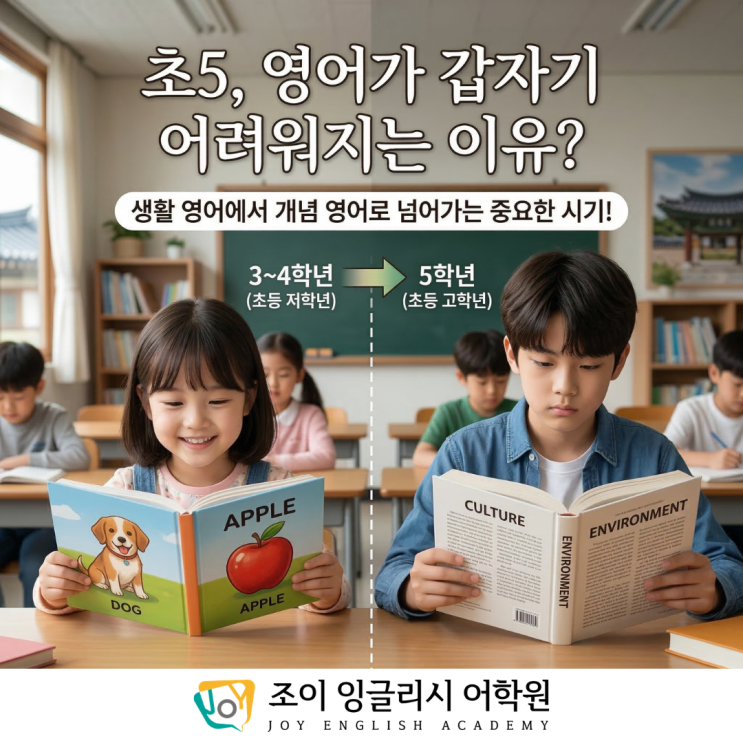 안녕하세요. 경주 조이잉글리시어학원입니다. 학부모님들과 상담을 하다 보면 종종 이런 이야기를 듣습니다. “우리 아이가 3~4학년 때까지는 영어를 재미있어 했는데 5학년이 되니까 갑자기 어렵다고 해요.” 사실 이런 변화는 꽤 많은 아이들에게 나타나는 자연스러운 현상입니다. 왜 이런 일이 생길까요? 초등 저학년 영어는 ‘생활 영어’입니다 초등 저학년 때 배우는 단어들은 대부분 생활 속에서 쉽게 떠올릴 수 있는 단어들입니다. 예를 들면 dog, water, school, run, happy 같은 단어들입니다. 이 단어들은 아이들이 이미 알고 있는 개념입니다. 아이의 머릿속에는 이미 개, 물, 학교, 먹다 같은 이미지가 있기 때문에 영어를 배....... <img src="https://blogthumb.pstatic.net/MjAyNjAzMTZfMjU1/MDAxNzczNjYxNzE4MTU0.NJG64JNY65GQWM8pK6K-4vKY381ejEenNA92m2n6yn4g.as68zb9wkTWukGTgr2eIsi9fKQ23pEpru-sbjsFgD5gg.PNG/%C1%A6%B8%F1_%BE%F8%C0%BD_%281080_x_1080_px%29.png?type=s3" />