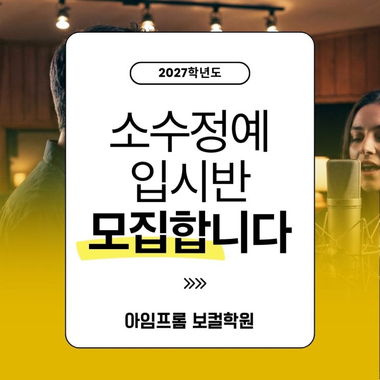 안녕하세요 신사역 실용음악학원 아임프롬 보컬학원입니다 :) 오늘은 2027학년도 실용음악과 입시를 준비하는 분들을 위해 아임프롬의 '소수정예 입시반' 소개를 해드릴게요 합격자 수보다 중요한 건 '등록생 대비 합격률'입니다. 입시 상담을 하다 보면 이런 질문을 많이 받습니다. "이번에 몇 명 정도 합격했어요?" 물론 합격자 수가 많아 보이면 잘 하는 학원처럼 보일 수 있습니다. 하지만 정말 중요한 기준은 따로 있습니다. 등록생 대비 몇 명이 합격했나요? 저희 아임프롬은 합격자 수를 늘리지도 않으며, 그간 몇 년간 합격된 학생 수를 더하여 이번 연도에 많이 합격한 것처럼 보이게 하지 않습....... <img src="https://blogthumb.pstatic.net/MjAyNjAyMDRfNzkg/MDAxNzcwMTk2NjI3Mjg0.ZR8-P2gFOOnrCq3Xl3TgpzWMLQvuoXbX84HEFXQy3H4g.FO61lPvvivuynidCVYtFg95D_raCjN2VEvndbaJwfE0g.JPEG/1.jpg?type=s3" />