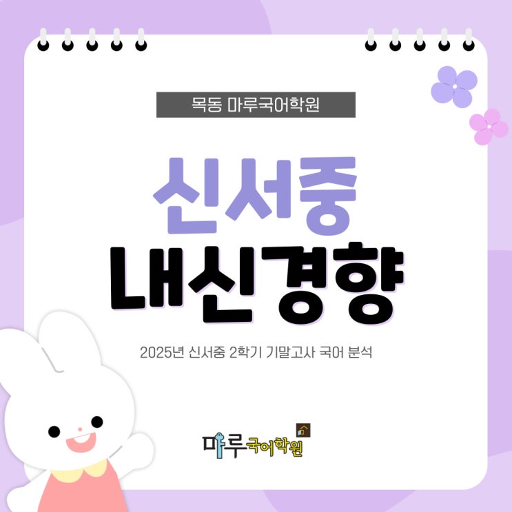 안녕하세요, 목동 마루국어학원입니다! 오늘은 신서중 국어 내신 경향을 분석해보겠습니다. 시험 범위와 난이도, 그리고 실제 시험에서 어떤 유형의 문제가 출제되었는지 정리해 보았습니다. (2025년 신서중학교 2학기 기말고사 기출 분석) 시험 범위 이번 기말고사의 시험 범위는 다음과 같습니다. 1단원 (1) 2단원 (1), (2) 4단원 (1), (2) 중간고사를 실시하지 않았기 때문에 기말고사 시험 범위가 비교적 넓은 편이었습니다. 시험 난이도 전체적인 난이도는 ‘중’ 수준이었습니다. 다만 중간고사가 없었던 만큼 시험 범위가 넓어 학습량이 많았던 시험이라고 볼 수 있습니다. 특히 학교에서 제공한 학습지에서 유사하거나 동일한....... <img src="https://blogthumb.pstatic.net/MjAyNjAzMTVfMzYg/MDAxNzczNTYzOTY2NDIw.0OZ1YBQbf5e3br-_j5CeeQVPImnGkd5unN7n5LN0abog.kG-MJBr8h3D_AFr0d_Y-tnsdL7Lx6wCqE8gr-T5YsnAg.JPEG/001.jpg?type=s3" />