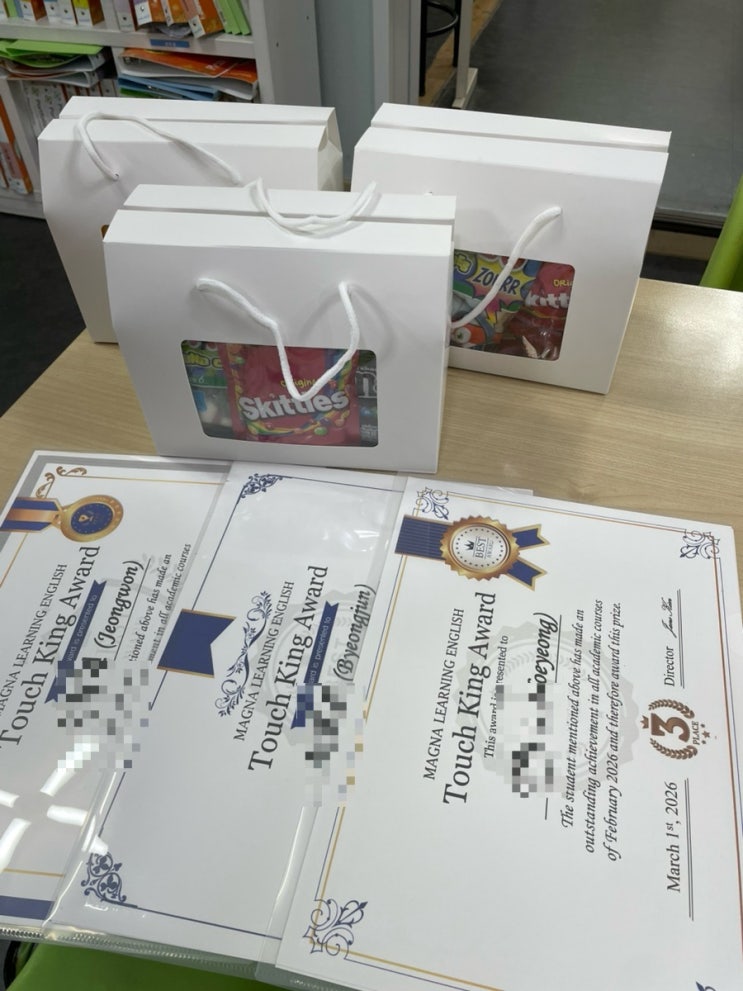 안녕하세요 대치동 No.1 영어도서관, 매그나러닝 영어독서학원입니다. 1–2월 Touch King Award가 발표되었습니다 매그나러닝에서는 영어 단어 학습을 꾸준히 실천하고 성실한 학습 태도를 보여준 학생들에게 Touch King Award를 수여하고 있습니다. 이번 1–2월에도 단어 학습을 꾸준히 이어가며 좋은 학습 습관을 보여준 학생들이 선정되었습니다. Touch King은 어떻게 선정될까요? 가장 중요한 기준은 바로 포인트 적립입니다. 단어 학습을 성실히 수행하고 책을 꼼꼼히 읽어 퀴즈 정확도가 높을수록 포인트가 자연스럽게 쌓이게 됩니다. 포인트를 많이 모으는 방법을 정리해 보면, 1️⃣ 주 3회 이상 꾸준히 등원하기 2️⃣ 단....... <img src="https://blogthumb.pstatic.net/MjAyNjAzMDdfMTEg/MDAxNzcyODgyNTM5ODYx.y5gbVs0Zm1fcBNJ4vuP_lGBJxD_eUDIPdXQPx_NlvOIg.TP1ywyFU2w5ddM2eWEfjcNZ0K1qEK4Y1XdtxyMfobZ8g.JPEG/output%A3%DF2214737603.jpg?type=s3" />