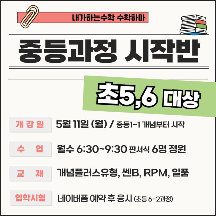 안녕하세요. 수학하마입니다. 중등과정 개강반 소식입니다. 초5, 초6 대상의 중등교과 시작반(월수반)을 2026년 5월 11일(월)에 개강합니다. 한 학기 3~4개월 학습으로 계획되어 있으며 초견을 기준으로 개념부터 차근차근 공부하는 반입니다. ① 개념플러스유형으로 개념을 공부한 후 ② 쎈B로 유형 학습을 하고 ③ 일품으로 준심화 문항을 배우며 동시에 RPM으로 유형 학습에 대한 복습을 합니다. ④ 최상위, 에이급, 블랙라벨 등의 심화서는 방학을 이용하여 개별로 학습합니다. 입학 시험은 네이버폼 신청서를 통해 예약 후 응시할 수 있습니다. 기타 자세한 문의는 학원으로 전화해 주시면 안내해 드리겠습니다. 감사합니다. <img src="https://blogthumb.pstatic.net/MjAyNjA0MjhfMjAw/MDAxNzc3Mzc1OTA5MTk1.BtSxL1kjfEL-Z17-xy4bXEP1g17nBliwmNPiD1UCM18g.Q2d7HJjoBhBH-qO4TxQTCgWUF-Vw_YE-4821Qm00iMkg.PNG/%C1%A6%B8%F1%C0%BB_%C0%D4%B7%C2%C7%D8%C1%D6%BC%BC%BF%E4_-003_%284%29.png?type=s3" />