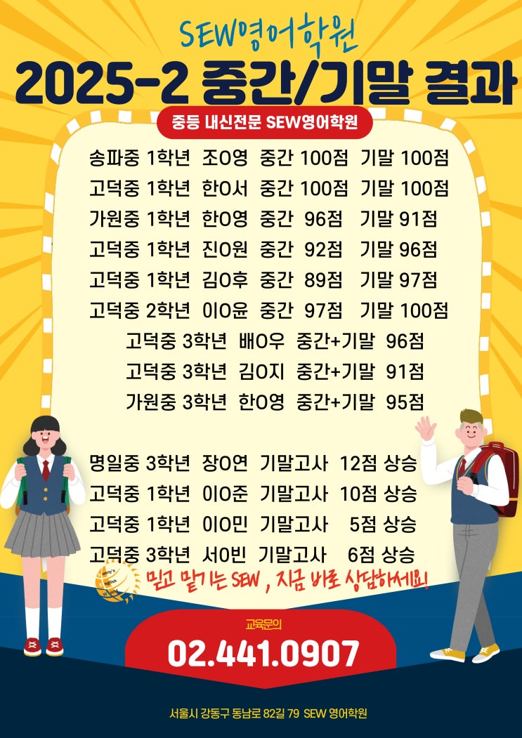[SEW 영어학원] 2025 2학기 고덕중 명일중 중간/기말고사 후기 강동구 고덕 / 상일동 영어학원