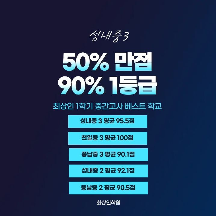 성내동 영어학원 최상인학원 │ 성내중 3학년, 절반 만점·90% 1등급의 결과
