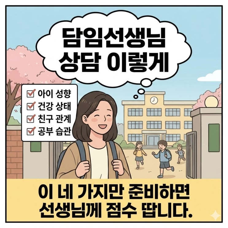 학부모 상담, 이렇게 진행돼요. 상담 가기 전 부모님이 한 번 읽어보시면 좋은 이야기예요. 새 학기가 시작되면 학교에서는 학부모 상담 주간이 열려요. 이 시기가 되면 많은 부모님들이 비슷한 고민을 하세요. "선생님을 만나면 무슨 말을 해야 하지?" "이상한 질문을 하면 어떡하지?" "상담 시간이 짧다던데 미리 준비를 해야 하나?" 특히 처음 학교 상담을 가시는 1학년 학부모님들은 더 긴장하세요. 아이를 학교에 보내는 것만으로도 마음이 바쁜데, 선생님을 직접 뵙는 자리라고 생각하면 괜히 더 조심스러워지기도 해요. 하지만 실제 상담은 생각보다 단순한 경우가 많아요. 몇 가지 질문을 주고받다 보면 대....... <img src="https://blogthumb.pstatic.net/MjAyNjAzMTBfMjM2/MDAxNzczMDc1OTAxOTIw.0BjfkC7CcWyD2bAWVOL-KwrcYVLOIPGGGWlCyuS2-Agg.-WtbCaEyey6okgDJ1_aoKgGb0tmTYQcaawwCYAPsozkg.JPEG/0.jpg?type=s3" />