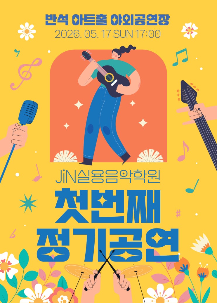 안녕하세요! 일상에 음악을 채우는 JiN실용음악학원입니다!^_^ 드디어 기다리던 소식, 첫 번째 정기공연이 진행됩니다!! 그동안 열심히 연습해온 음악이 무대 위에서 펼쳐지는 날이에요. 수강생분들이 직접 준비한 공연인 만큼 더 의미 있고, 더 특별한 시간이 될 예정입니다! 일시 : 2026년 5월 17일(일) 오후 5시 장소 : 동탄 반석아트홀 야외공연장 편하게 오셔서 음악도 듣고 여유롭게 분위기도 즐기다 가세요. 좌석도 준비되어 있고 잔디에 돗자리 펴고 피크닉처럼 즐기셔도 좋아요! 소소한 이벤트와 선물도 준비되어 있으니 가볍게 놀러 오시는 마음으로 오시면 됩니다. 누구나 자유롭게 관람 가능하니 가족, 친구들과 함께 오셔도....... <img src="https://blogthumb.pstatic.net/MjAyNjA0MjlfMTE4/MDAxNzc3NDY3Mzc5NTYw.lPgvJyvPfPLzjMyZP45oub7QIu-jOfiD59ptVjGDrtYg.Ch1Rv_337G6SLLRqSbfeDGXtsbO9TcUGsShOKDWjb7Ag.JPEG/KakaoTalk_20260428_153512699.jpg?type=s3" />