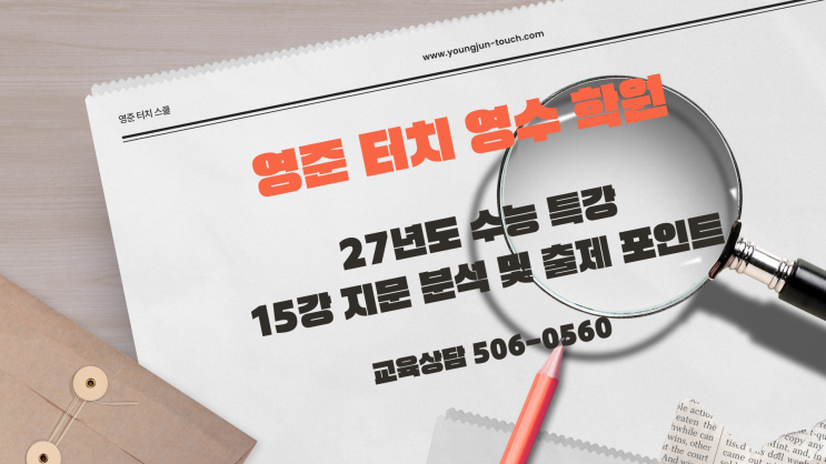 2027년 수능 특강 영어 분석입니다. 수능 특강 15강입니다. 수업하기 전에 제가 한 번 만들어 본겁니다. 수업후에 틀린 분석이나 오타를 수정합니다. 학원 학생들을 위해 직접 만들었습니다. 공부에 조금이나마 도움이 되길 바랍니다. 항상 직접 분석을 지문 마다 정성을 다해서 만드는 영준터치 영수학원입니다. 영어가 어려운 학생들은 언제나 상담 환영합니다. <img src="https://blogthumb.pstatic.net/MjAyNjAzMDVfMjUx/MDAxNzcyNjY4Mjg3NzIx.ayjPE423MN0BWzZdvMAr-KbjcuaCzuiIsuslULeIHvUg.8imyKDY8PaU8ZLy7OE4UOc2DNFx1UtXytH9tU76SNdkg.PNG/%C8%B8%BB%F6%B0%FA_%C1%D6%C8%B2%BB%F6_%BD%C5%B9%AE_%B5%B8%BA%B8%B1%E2_%B9%E8%B0%E6_%C0%E7%B9%CC%C0%D6%B4%C2_%C6%B2%B8%B0_%B1%D7%B8%B2_%C3%A3%B1%E2_%C4%FB%C1%EE_%B0%D4%C0%D3_%B7%B9%C5%A9%B7%B9%C0%CC%BC%C7_%C7%C1%B7%B9%C1%A8%C5%D7%C0%CC%BC%C7__%2823%29.png?type=s3" />