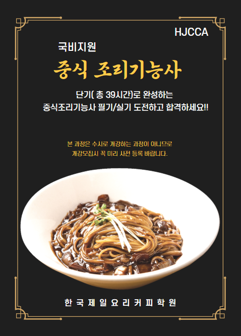 중식조리기능사(필기/실기) 개강 안내 일정 : 2/10 ~ 3/26 -> 2/24 ~ 4/7 (일정이 임박해서 망설이셨던 분들! 일정이 변경되었습니다:) 시간 : 18:30-21:30 (화/목) 금액 : 286,620원(국비 진행 시) 중식조리기능사(필기/실기) 과정 2/24(화) 개강으로 국비 진행 시 286,620원으로 저렴하게 수강 가능하십니다! 해당 과정 수강 희망 시 아래 번호로 전화 주시면 빠르게 상담 도와드리도록 하겠습니다!! ☎️ 051-333-2215 ✨ 오시는 길 : 덕천역 2번출구 -> 다이소 7층 건물-> 한국제일요리커피학원 <img src="https://blogthumb.pstatic.net/MjAyNjAyMTNfMTkz/MDAxNzcwOTU1ODcyOTE2.qMHnU9VSGtzd3kJB_s3CVZu5bbi53p_fTws8FtjSznMg.oJN7I_AS9VtXSLdIZ9h9rmuqOTiqToab33uoeHLUNkwg.PNG/%C1%DF%BD%C4_%C8%AB%BA%B8%B9%B0.png?type=s3" />