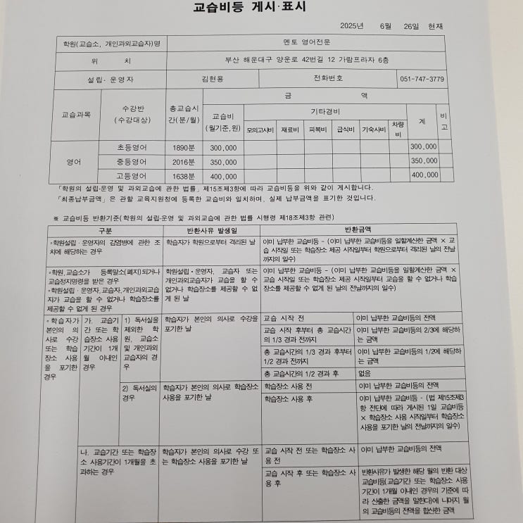 교습비등 게시