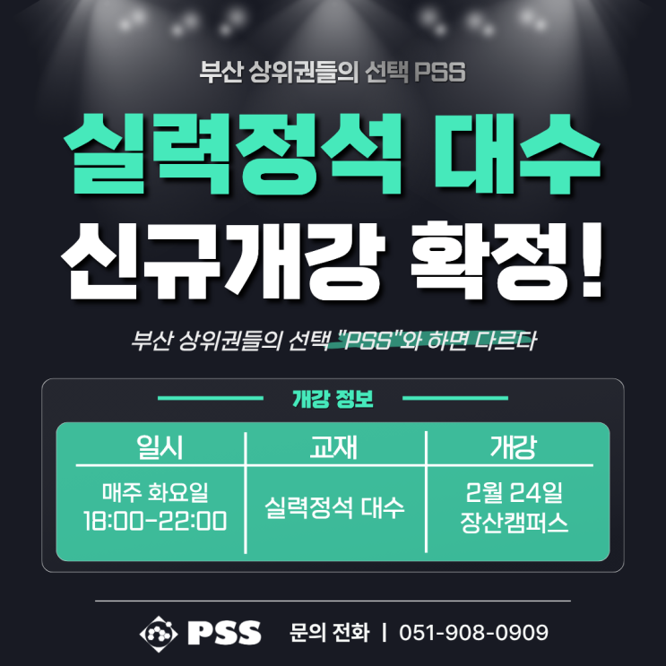PSS 장산캠퍼스 고등 판서 신규개강 안내드립니다. ▶실력정석 대수 • 개강: 2월 24일(화) • 시간: 18:00-22:00 • 장소: 장산캠퍼스 • 교재: 실력정석 대수 상담 문의는 각 캠퍼스로 연락주시면 안내도와드리겠습니다. [캠퍼스 안내] ■ PSS 센텀1캠퍼스 번호 ㅣ 051-991-0907 주소 ㅣ 부산시 해운대구 센텀2로 10 메디컬센터 7층 ■ PSS 센텀2캠퍼스 번호ㅣ 051-711-0908 주소ㅣ 부산시 해운대구 센텀2로 29 메커스빌딩 6층 ■ PSS 장산캠퍼스 번호ㅣ 051-908-0909 주소ㅣ 부산시 해운대구 세실로 43 경동코아 8층 <img src="https://blogthumb.pstatic.net/MjAyNjAxMjdfMTgy/MDAxNzY5NTExMTczOTk1.zAOkDafki5Xkyl9UOPQs23IwvwfzsURAHp7U4n2I6B4g.emx_VmynutNz8oVA3rNOkeZ-99LEx1GCxcJfHEXXLxcg.PNG/%BD%C7%C1%A4%B4%EB%BC%F6_2%BF%F9_24%C0%CF_%B0%B3%B0%B3%B0%AD.png?type=s3" />