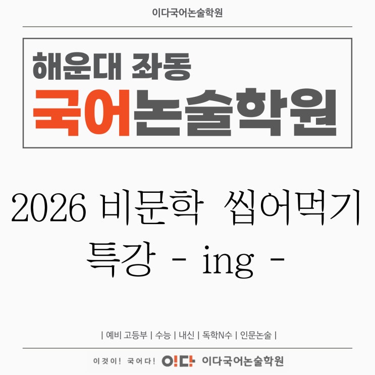 안녕하세요 장산 고등국어 전문학원 이다국어논술학원입니다 지난번 포스팅을 통해 한차례 소개해드린 바 있는 2026 겨울 시즌 이다국어논술학원의 시그니처 특강! 비문학 씹어먹기 특강은 매주 월화목금 꾸준히 진행 중이랍니다 어떤 문제가 틀렸는지 알려주지 않고 모든 문제를 맞힐 때까지 계속 지문을 읽어보고 문제와 선지도 꼼꼼히 파악하게 만드는 이다국어 원장님 직강, 비문학 특강! 비문학 씹어먹기 특강의 핵심은 문제를 풀어내는 것보다도 지문의 주제와 핵심내용을 파악하고 논리적으로 요약 정리를 하는 과정에 있답니다 요약 정리를 할 수 있어야 문제의 취지를 빠르게 파악할 수 있고 선지를 고를 때에도 빠르게 정답을 골라낼 수....... <img src="https://blogthumb.pstatic.net/MjAyNjAxMjdfMjg3/MDAxNzY5NDkyNTc0MzQ4.29oYSYK8Oxcr46o85ZEV_Gb983prAt6fGQLEbKfO8mQg.Kpa9sLMZmODJkWghquBzGU4Bqxy4BDcVWyjiIeYsjb4g.JPEG/%C0%CC%B4%D9%B1%B9%BE%EE-%B3%D7%C0%CC%B9%F6-%BA%ED%B7%CE%B1%D7-%C1%A4%BB%E7%B0%A2%C7%FC-003.jpg?type=s3" />