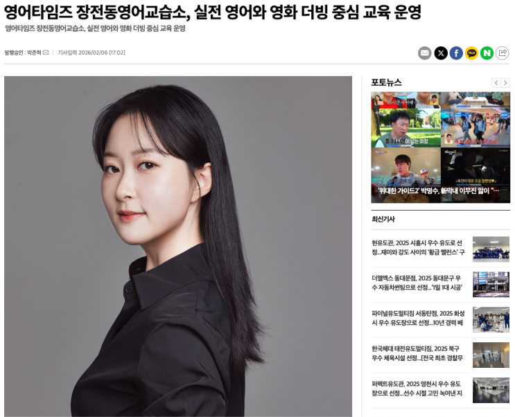 감사한 기회로 소상공인전문체널 '베스트타임즈'와 인터뷰를 하는 기회를 가지게 되었습니다! 제 돈 내고 광고한거 절대! 아니구요!! 부산 금정구 영어학원 으로써 독특한 커리큘럼으로 화제가 되어 이렇게 인터뷰도 하게 되고 기사에 나오게 되었네요 쑥쓰럽지만 영어타임즈만의 자부심을 가득 담은 기사!! 여러분께 소개드려볼게요 ㅎㅎ 부산 금정구 장전동에 위치한 영어타임즈 장전동영어교습소(원장 이현경)를 찾았다. 이현경 원장이 운영하는 이곳은 실전 영어 구사 능력 향상을 목표로 영화 더빙 등 몰입도 높은 교육 프로그램을 제공하며 지역 학생들과 소통하고 있다. 이 원장은 수도권에서 오랜 기간 강사 생활을 거....... <img src="https://blogthumb.pstatic.net/MjAyNjAyMTNfMjY2/MDAxNzcwOTU4NDM3ODUy.j3D_yi6Mzb0QzgT7v1mKXSyEURDggVPUwmMyEBxOlRIg.UxlqjXI33DMW6uTaXMXvOLKm624SsVU4xsdWqMpijTog.PNG/image.png?type=s3" />