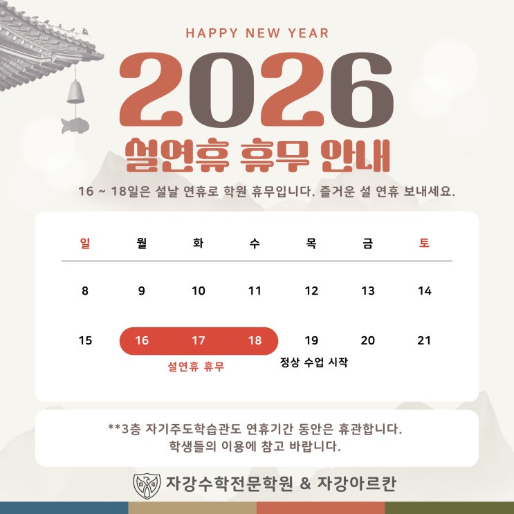 안녕하세요, 이상수학학원입니다. 새해를 맞이하며 마음이 새로워지는 이 시기, 곧 다가올 설 연휴는 학생들에게 특별한 기회가 될 수 있습니다. 1. 짧지만 결정적인 설 연휴 설 연휴는 단순히 쉬는 시간이 아닙니다. 오히려 새 학기를 앞두고 흐트러진 공부 리듬을 바로잡을 수 있는 가장 중요한 시간입니다. 겨울방학 동안 열심히 공부했던 학생도, 방학을 조금 느슨하게 보낸 학생도 설 연휴를 어떻게 보내느냐에 따라 새 학기 성적의 출발점이 달라질 수 있습니다. 특히 수학은 ‘조금만 쉬어도 감각이 떨어지는 과목’이기 때문에 설 연휴는 오히려 감각을 다시 끌어올리고, 개념을 정리할 수 있는 황금 타이밍이 됩니다. 바쁜 학기 중에는....... <img src="https://blogthumb.pstatic.net/MjAyNjAyMTFfNTcg/MDAxNzcwODE0MTYxMjI3.xN9_L981RXhzXINSIWPNM1W7PW3TqVj0pdKj-oY6HGMg.44EhPmxT9rnZ8wpD30gfv8Q8haijhQo_NbjktiaYuzAg.PNG/1.png?type=s3" />