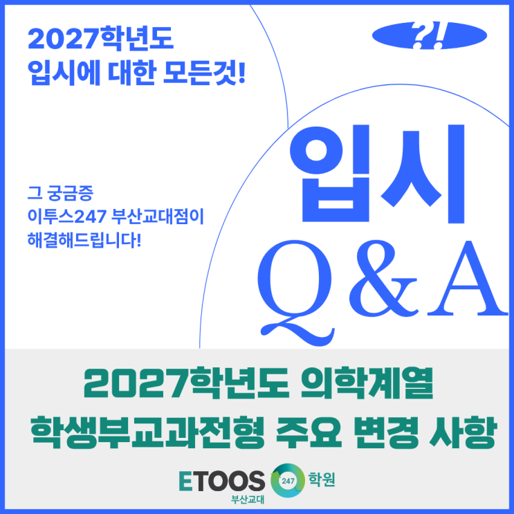안녕하세요. 이투스247 부산교대점입니다. 오늘은 의약학계열 입시를 준비하는 수험생과 학부모님들께 아주 중요한 정보를 가져왔습니다. 바로 2027학년도 의약학계열 학생부교과전형 주요 변경 사항인데요! 2027학년도에는 수능 최저 기준 완화부터 출결 반영, 지원 자격 강화까지 크고 작은 변화가 예고되어 있습니다. 특히 비수도권 지역인재전형을 고민 중이라면 이번 포스팅을 끝까지 주목해 주세요! 자세한 내용은 아래에서 만나보시죠! 2027 의약학계열 교과전형, 무엇이 달라지나? 가장 눈에 띄는 변화는 수능 최저학력기준의 변화와 학생부 반영 방식의 디테일입니다. 주요 대학별 핵심 포인트를 콕콕 집어 정리해 드릴게요. ✅수능 최....... <img src="https://blogthumb.pstatic.net/MjAyNjAzMDVfMTM3/MDAxNzcyNjg5OTMxMjkx.S1_ylj98jV1NVaiz74LYJU_pDGLhMfSTJYJhupFkljMg.dAX3WSX2gwbFlVMtKhOFUk1unMrH19pa1nA3fkIAsI4g.PNG/%C1%A6%B8%F1%C0%BB_%C0%D4%B7%C2%C7%D8%C1%D6%BC%BC%BF%E4._%281%29.png?type=s3" />