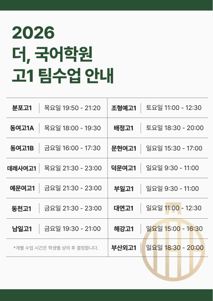 [부산국어학원] 2026 더, 국어학원 고1 팀수업 시간표 안내