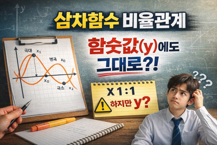 ❓삼차함수의 비율관계, 함숫값(y)에도 그대로 써도 될까? ― 많은 학생이 여기서 틀립니다 삼차함수 문제를 풀다 보면 이런 생각, 한 번쯤 해본 적 있을 겁니다. “x좌표가 1:1 비율이면 함숫값도 뭔가 비율이 있지 않을까?” 실제로 이 생각 때문에 맞는 풀이를 하다가도 마지막에 틀리는 경우가 정말 많습니다. 오늘은 ✔️ 삼차함수의 ‘비율관계’가 정확히 무엇인지 ✔️ 어디까지 써도 되고, 어디서부터 위험한지 를 딱 시험 기준으로 정리해보겠습니다. 1. 삼차함수에서 말하는 ‘비율관계’의 정체 내신·모의고사에서 말하는 삼차함수의 비율관계는 대부분 이것입니다. 극대점 – 변곡점 – 극소점의 x좌표 관계 삼차함수 에서 극....... <img src="https://blogthumb.pstatic.net/MjAyNjAyMDVfMTg0/MDAxNzcwMjIzNTU4NDcw.GuBNmIXqNyHztPJUG8DgSkEryVmfLgOb-9KshzibP_Mg.vfalzSx8hisAau_F0t5g3tzeUZfG1cWzVAPegyRgDAUg.JPEG/%BB%EF%C2%F7%C7%D4%BC%F6%BA%F1%C0%B2_%BD%C7%BB%E7.jpg?type=s3" />