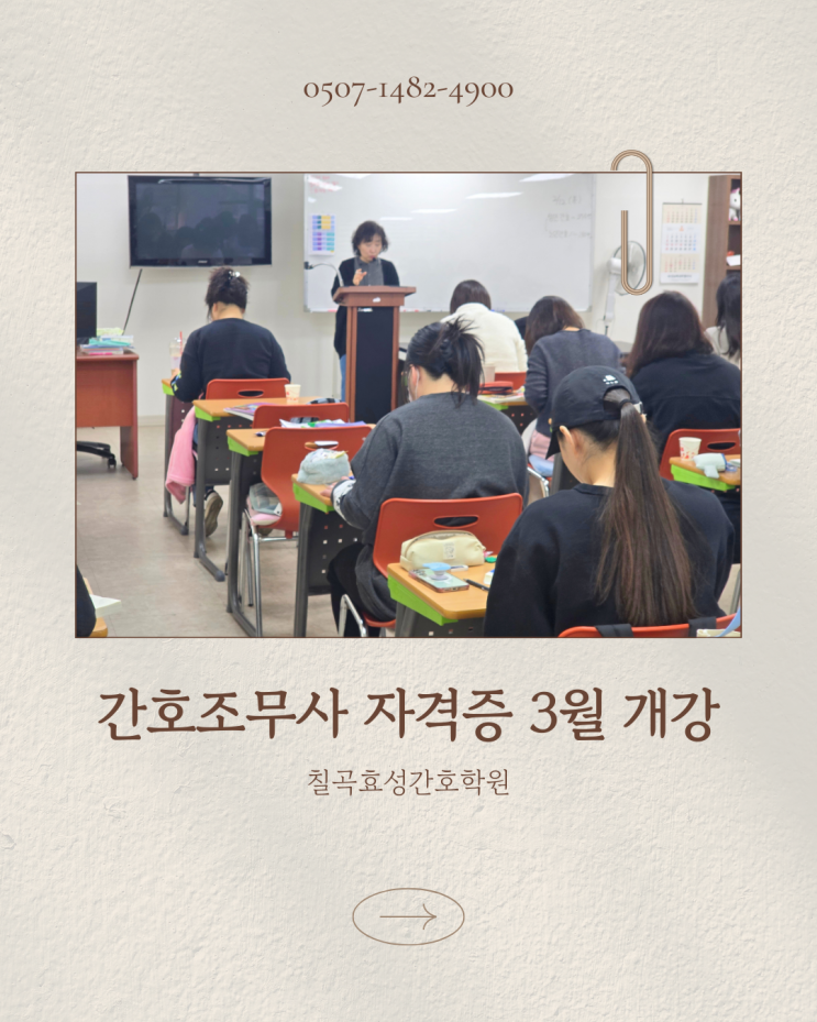 새 학기가 시작되는 3월은 새로운 진로를 고민하기에 가장 적절한 시기입니다. 특히 의료 분야에 관심은 있지만 막연한 두려움 때문에 망설여왔던 분들이라면, 간호조무사 과정은 현실적인 선택지가 될 수 있습니다. 칠곡효성간호학원은 이러한 고민을 가진 분들을 위해 3월 개강 과정을 운영하며, 처음 시작하는 수강생도 부담 없이 적응할 수 있는 교육 환경을 갖추고 있습니다. 간호조무사 교육은 단순히 시험 준비에 그치지 않고, 의료 현장에서 요구되는 기본 소양을 함께 익히는 과정입니다. 칠곡효성간호학원에서는 간호의 기본 개념부터 의료 기초 지식까지 차근차근 다루며, 이해를 돕기 위한 반복 설명과 정리 수업을 병행합니다. 기초....... <img src="https://blogthumb.pstatic.net/MjAyNjAyMTFfMTY2/MDAxNzcwNzkwNjI3NDMy.A-YTghTQ_YAy3DOtl3OY1489fjIb5DTkuAWJlgajLHog.9GSZCx96DqUWI5HAhbrg7pSllVK-jKtWyxBvwi7b8ncg.PNG/%C4%A5%B0%EE%C8%BF%BC%BA%B0%A3%C8%A3%C7%D0%BF%F8_%B0%A3%C8%A3%C1%B6%B9%AB%BB%E7%C0%DA%B0%DD%C1%F5.png?type=s3" />