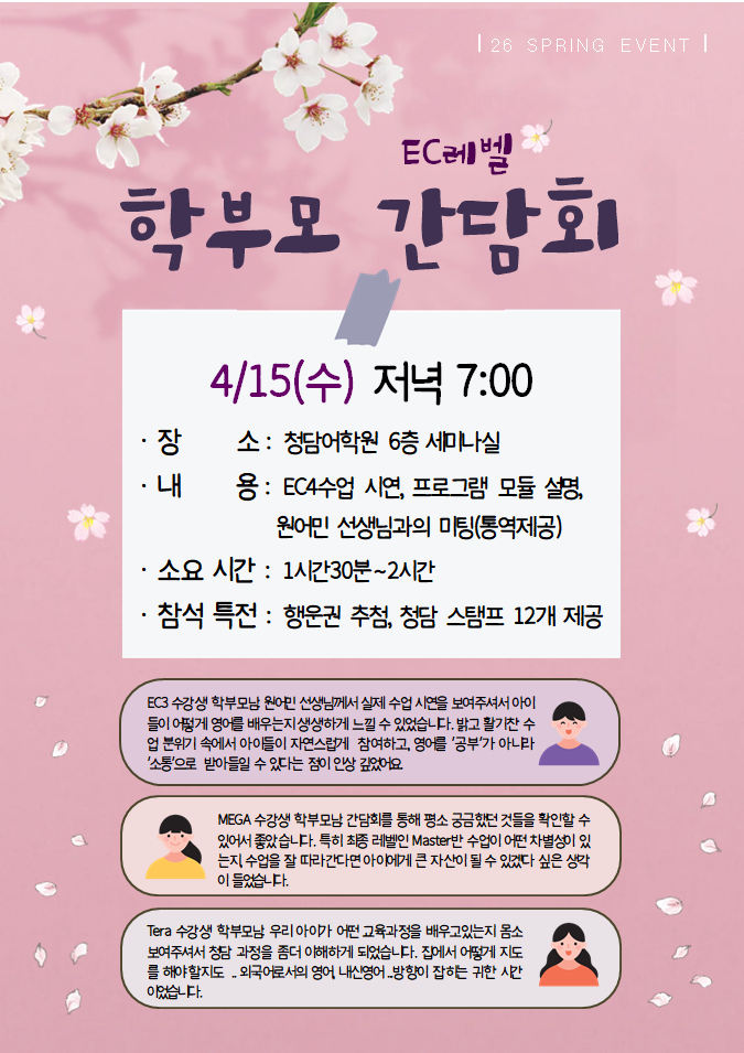 재원생 학부모님, 안녕하세요? 우리 아이들이 하는 수업이 어떻게 진행되는지, 가르치는 강사님도 어떤분이신지 궁금하셨지요? 여러가지 궁금증을 해결해 드리고자 간담회를 진행하니 바쁘시더라도 시간을 내주시면 감사하겠습니다^^ ★일정 EC레벨 : 4/15(수) 오후7시 Mega, Giga, Tera레벨 : 4/22(수) 오후 7시 ★간담회 진행내용 -수업시연 -원어민 선생님과의 미팅(통역있음) -프로그램 모듈 설명 신청 및 문의는 상담교사 업무폰으로 연락바랍니다 :) <img src="https://blogthumb.pstatic.net/MjAyNjAzMTZfMTkx/MDAxNzczNjM5ODI5NTUy.MypapqCgiBuADeh2dBHFEOjMggJn9zmokkanU0uo-8Ag.bkTVnEpgDZnce9-QyqBJuPs8j-t05W5tS-SeYiL2fOEg.PNG/image.png?type=s3" />
