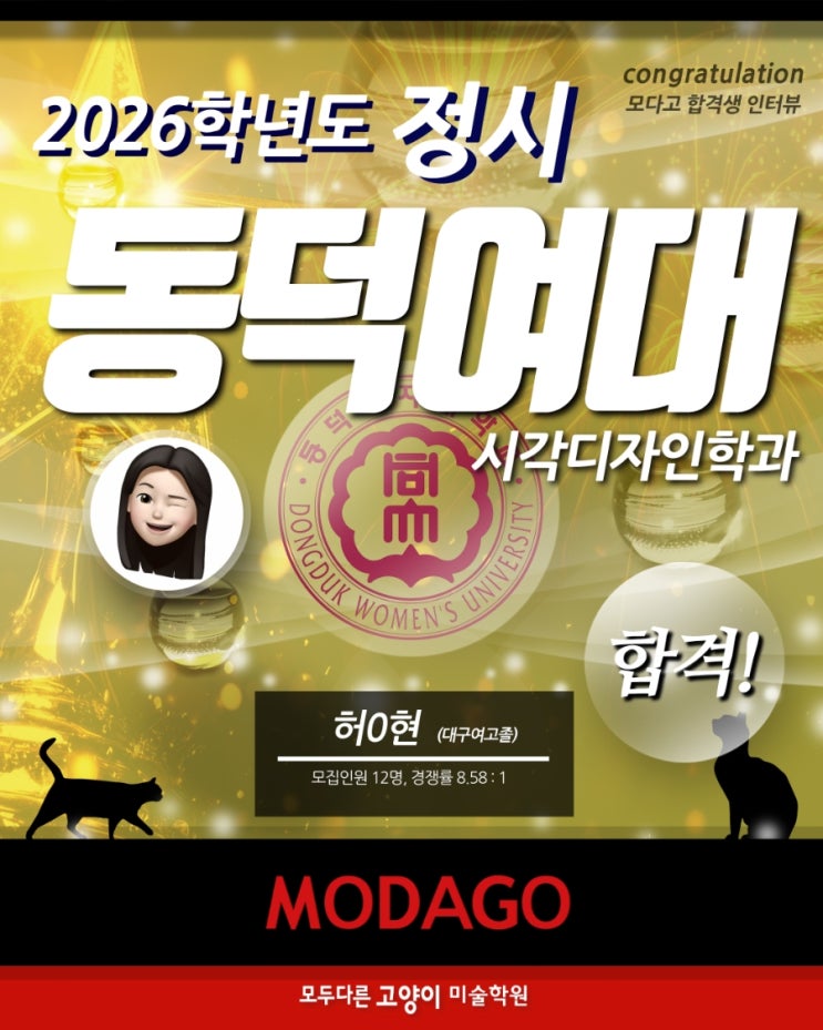 ※2026학년도 미대입시 합격생 인터뷰/재현작 공개 소식은 본 블로그 카테고리 [모다고 소식] 란에서 여러 대학 합격 Q&A를 열람할 수 있습니다. 대구 수성구 범어동, 만촌동, 황금동 미대입시 명문 모다고미술학원 합격생 인터뷰! ※모두다른고양이미술학원은 프랜차이즈가 아닌 대구/홍대앞/일산 본원 단일학원입니다. 2026학년도 정시 미대입시 동덕여대 시각디자인학과 합격! 대구여고 졸 허○현 모집 정원 12명 경쟁률 8.58:1 Q. 지원한 대학, 학과, 전형, 지원 동기가 무엇이며 어떻게 준비했나요? A. 동덕여대 디자인이노베이션대학 시각/실내디자인전공에 지원했습니다. 평소 일러스트와 편집디자인에 관심이 있어 시각디자인과를 지....... <img src="https://blogthumb.pstatic.net/MjAyNjAzMTZfMjc2/MDAxNzczNjAwNjc0MDc3.VJw4jRby-JFti1ucSEpjh-b42JJqZ4RLkreDxUp80O8g.bz18PZ524i1NNpLL0mc7ITjlspXLmk9F7B1TPFJa_I8g.JPEG/900%A3%DF1772605384813.jpg?type=s3" />