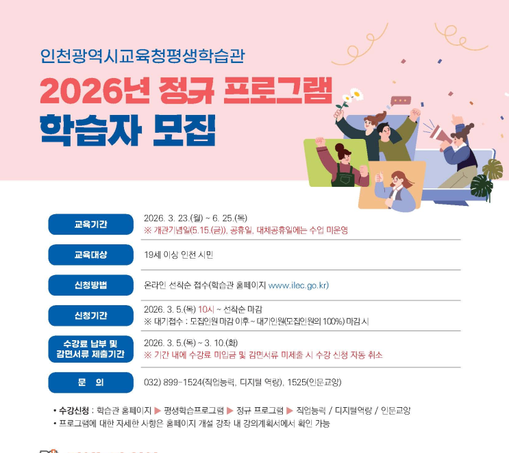 일상을 여행하는 어반스케치 선착순 15명 3월23일~6월 15일 (12회) 월요일, 10시~12시 인천광역시 교육청 평생학습관 118호 접수문의 - 032)899-1525 신청기간 - 2026.3.5.목, 10시~ 선착순 마감. 신청방법 - 온라인 선착순 <img src="https://blogthumb.pstatic.net/MjAyNjAyMTVfMTMx/MDAxNzcxMTMwNzg4NTg0.pyepTWQ4kQGdkRd6L4uPkknFymwnuKc5kbooqjNz-Y4g.psP54KCKgAdq-C328FqSEzQzQXkM9zLvLzcl8h6CWeog.PNG/KakaoTalk_20260215_134321238.png?type=s3" />
