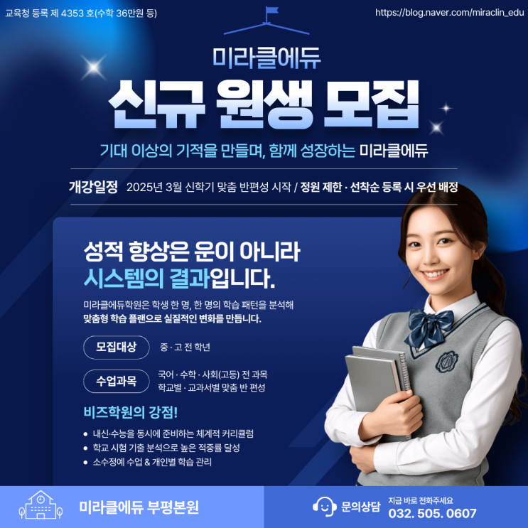 안녕하세요? 부평에서 가장 핫한 중고등부 수학&국어 전문학원 미라클에듀입니다. 지난 학기 힘들었던 몸과 마음을 재충전하면서 알찬 방학을 보냈던 학생 여러분!! 2026년 신학기가 다가왔습니다. 2025년 청천동 & 산곡동에서 가장 핫한 중등학원인 미라클에듀는 여러분의 성원에 힘입어 기대 이상의 기적을 만들었습니다. 중등부에서는 산곡남중, 부원여중, 부평서중 학생들이 수학 성적이 대폭 향상되었습니다. 수학 성적이 70점이던 부평서중 2학년 학생은 2학기 중간고사에서 100점을 받아 엄청난 성적향상을 이루었죠.. 산곡남중 1학년은 2학기 중간고사에서 전원 90점 이상을 받았고, 기말고사에서는 100점 학생을 배출하였습니다....... <img src="https://blogthumb.pstatic.net/MjAyNjAyMTRfMTA5/MDAxNzcxMDQxMjM0MjU5.4cnIcQO7-XCUSOXxYVuo5JF-CSJfaZcL5-i7E3zInYog.7Gfuwbkbv3IBrthO_Dzo9JX-oYsSPrpbfPJvUVnHRdQg.PNG/%C1%A6%B8%F1%C0%BB_%C0%D4%B7%C2%C7%D8%C1%D6%BC%BC%BF%E4._-_2026-02-14T125334.735.png?type=s3" />