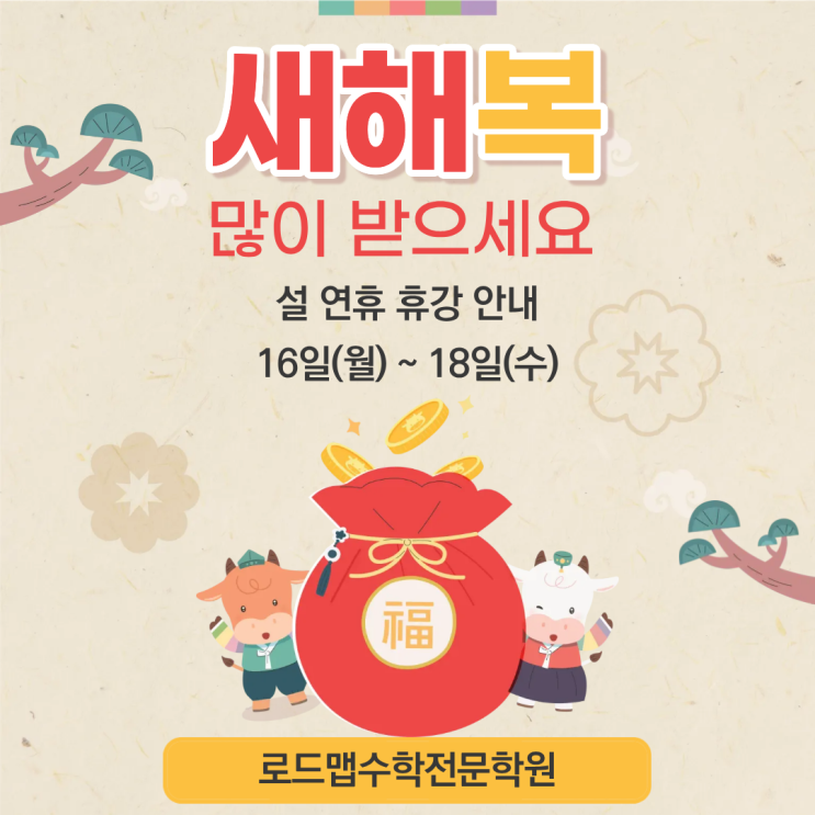 2026 병오년 새해 복 많이 받으세요. 지난 해에도 로드맵수학학원을 믿고 함께해 주신 학부모님과 학생 여러분께 감사드립니다. 붉은 말의 힘찬 기운처럼 목표를 향해 더 크게 도약하는 2026년 되길 바라며 열정과 집중의 힘으로 꿈을 현실로 만들 수 있도록 로드맵수학학원이 언제나 곁에서 함께하겠습니다. 따뜻하고 행복한 설 명절 되시길 바랍니다 <img src="https://blogthumb.pstatic.net/MjAyNjAyMTVfMjE4/MDAxNzcxMDg4MjA4MDQx.V11Ar8m59bEttqh3DFHYVZ6aoPeqKsg6qGJbLAyDPh4g.p5B1J1uQl0RqqfIu8KeXInO6octSTiFws1Sg1xU-4y0g.PNG/%C1%A6%B8%F1%C0%BB_%C0%D4%B7%C2%C7%D8%C1%D6%BC%BC%BF%E4._%282%29.png?type=s3" />
