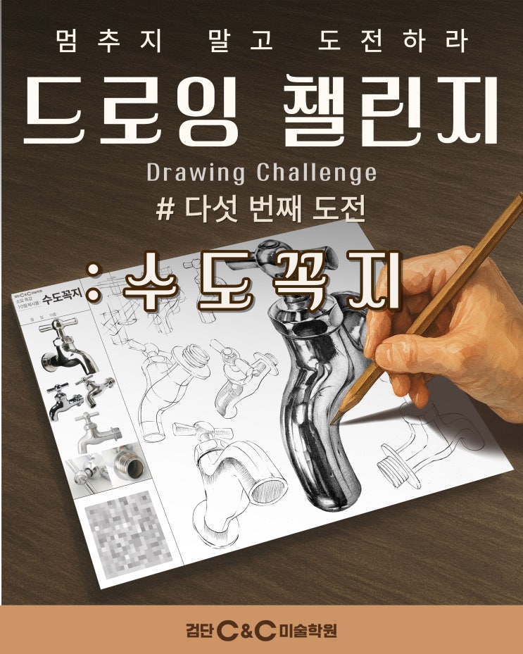 안녕하세요~ 인천 서구 검단신도시 검단미술학원 검단C&C미술학원입니다! 오늘은 '수도꼭지' 개체표현을 알려드리고자 합니다. 드로잉챌린지 다섯 번째 도전! 단계별로 함께 살펴봅시다~ 밑색 단계 금속 질감인 수도꼭지의 어두운 부분의 형태와 수도꼭지의 형태를 표현하며 전체적인 톤을 만들어주는 단계입니다. Tip. 일정한 방향으로 톤 깔기! 질감 표현 단계 어둠 안에서의 강약을 조절해 세밀한 형태를 만들고 밀도를 올려 질감을 묘사하는 단계입니다. Tip. 명도의 대비를 확실히 보여주기! 마무리 단계 강한 어둠과 가장 밝은 하이라이트를 강조하고 포인트 묘사들을 하며 그림을 마무리하여 완성하는 단계입니다....... <img src="https://blogthumb.pstatic.net/MjAyNjAxMzBfNDYg/MDAxNzY5Nzc1MjUzMjM3.Ry-DQRJp04TW-w7zoEewQ9l0FHeink4y3NGXkhGBzjog.KRRSHqURS0mcN6cXCw6wF37XPKSEvRkb7kdLkqgawmsg.JPEG/%BC%F6%B5%B5%B2%C0%C1%F6_%281%29.jpg?type=s3" />