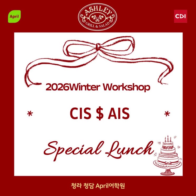CIS & AIS 마무리! 특별한 점심식사 열심히 달려온 겨울방학 특강! 마지막을 기념하며 애슐리에서 맛있는 점심식사를 함께 했어요! 맛있는 음식과 함께 웃음이 가득했던 시간! 특강 기간동안 최선을 다한 우리 학생들, 모두 수고 많았어요! 청라청담April친구들~ 앞으로도 즐겁게 배우고 성장하길 응원합니다!! <img src="https://phinf.pstatic.net/image.nmv/blog_2026_02_09_3872/H3FE6UJGlX_01.jpg?type=f480x480" />