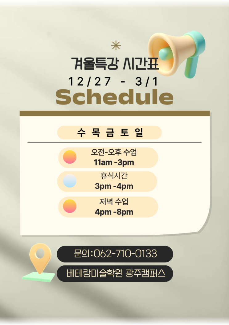 겨울특강 시간표 안내. 베테랑미술학원 광주캠퍼스, 광주입시미술학원 광주인체수채화 겨울방학특강 안내입니다.