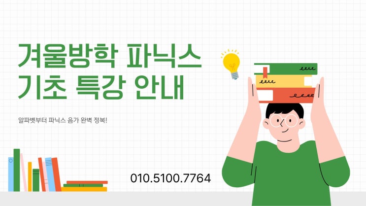 It's time to Reengki! 링키영어 화정1호점 원장 Winnie입니다. 어느덧 2025년도 1달도 남지 않았고, 링키영어 화정1호점에 다니는 화정남초, 염주초, 주월초, 금호초, 상무초 친구들의 겨울방학이 곧 다가옵니다. 초등아이들 겨울방학 정말 중요한 시기죠! 영어를 즐기면서 배우고 학습이 아닌 언어의 즐거움으로 느낄 수 있도록 겨울방학 특강을 준비했습니다. 겨울방학 파닉스 기초 특강 안내 영어의 시작은 파닉스입니다. 알파벳 소리부터 차근차근, 읽고–소리 내고–스스로 해독하는 힘을 키워주는 링키영어 화정1호점 파닉스 기초 특강을 진행합니다. ✔ 알파벳 소리 완벽 정리 ✔ 파닉스 규칙 이해 → 단어 읽기 연결 ✔....... <img src="https://blogthumb.pstatic.net/MjAyNTEyMTVfMTA4/MDAxNzY1NzY1NTUwOTc3.8RTAq9c85EJ97nLLyFLVzcTqHePkTsgyh9Q8ys2Dkewg.Fbwh0xevD3RlKdlmf0TQSFknzPM1kjDhr-vS3lE26mIg.JPEG/1.jpg?type=s3" />