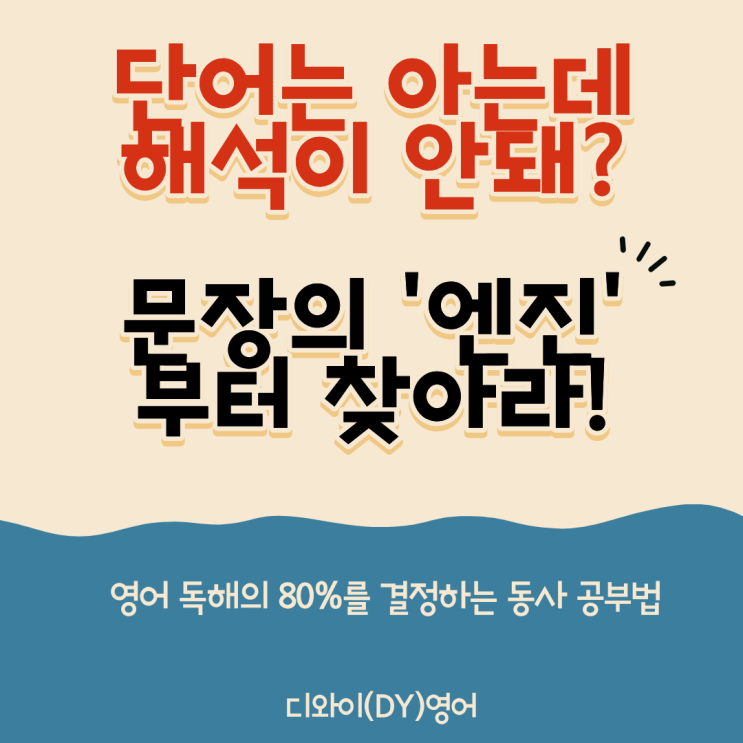 안녕하세요~ 디와이 영어 '디와이 쌤'입니다. 영어 문장을 읽을 때 단어는 다 아는데 해석이 꼬인다면, 가장 먼저 점검해야 할 것이 있습니다 바로 **동사**를 제대로 보고 있느냐 입니다. 왜 문법 공부의 시작과 끝이 '동사'여야 할까? 1. 동사는 문장을 끌고 가는 '엔진'입니다. 기차에서 가장 중요한 것이 엔진이듯, 영어 문장에서 구조를 결정하는 권력자는 '동사'입니다. · 동사나 구조: give라는 동사를 보는 순간, 자동적으로" 누구에게",무엇을" 줄지 뒤따라올 내용을 예측해야 합니다. · 예측 독해: 동사의 성질을 알면 문자아이 길어져도 당황하지 않습니다. 동사가 다음....... <img src="https://blogthumb.pstatic.net/MjAyNjAzMDFfMzAg/MDAxNzcyMzQzMzA3MTg3.CN0kVQjesry0tuBGQkFTMruqr_3b34NPsahjM2aq9ugg.ei30h1NqyS74XDas__izh6iJwO5gjMXSbL96Zw1_sdgg.PNG/%BF%B5%B5%B6.png?type=s3" />