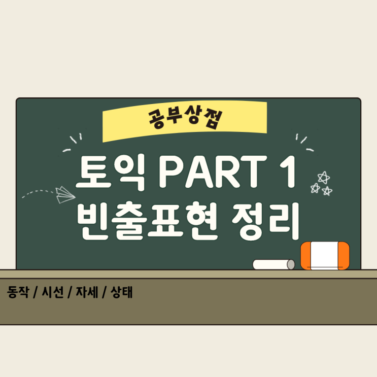 안녕하세요~ 공부상점입니다! 오늘은 토익 LC PART 1 묘사 문제중에 행동,시선,자세,상태 등을 정확하게 표현하는 빈출 표현을 알아보겠습니다! 1. 손 동작 묘사 표현 사진에서 사람이 무언가를 잡거나 작업하는 장면이 자주 출제됩니다. 2. 발 동작 묘사 표현 사람이 이동하거나 걷는 상황도 많이 출제됩니다. 3. 시선 관리 표현 사람이 어디를 보고 있는지 묘사하는 표현도 많이 출제됩니다. 4. 자세 묘사 표현 사람의 자세나 행동 상태를 설명하는 표현입니다. 5. 상태를 설명하는 표현 사진 속 사물이나 사람들의 상태를 설명할 때 사용됩니다. 토익 PART 1은 비교적 난이도는 쉬운 편이지만, 빈출 표현을 모르면 의외로 틀리기가 쉬운 파트....... <img src="https://blogthumb.pstatic.net/MjAyNjAzMTFfNTAg/MDAxNzczMjE2Njk3NzA4.iMTv6hCSoly-WB7HTG99K5sQ0tzrJBr-6xl2plrLLV0g.01ZwzM8OG58ODVWVbqnVRLO8hT1CoWMiG4EX7HvOPMQg.PNG/%C1%A6%B8%F1%C0%BB_%C0%D4%B7%C2%C7%D8%C1%D6%BC%BC%BF%E4..png?type=s3" />