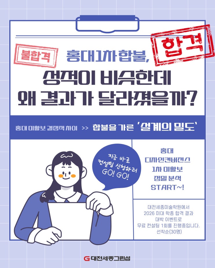 #홍대 #미활보 [미활보 분석 1편] 성적은 비슷한데 결과는 왜 정반대일까? 홍대 디자인컨버전스 합격과 불합격을 가른 결정작 차이는 바로 "설계의 밀도" 안녕하세요 #대전 #세종 #그린섬 #미술학원 입니다. #2026학년도 #홍익대학교 미술우수자 전형 결과가 발표된 후 많은 부모님들과 학생들로부터 비슷한 질문을 받았습니다. "비슷한 성적인데 우리 아이는 왜 1단계에서 탈락했을까요?" 왜 홍대 디자인컨버전스는 '그림 스킬' 보다 '설계' 를 선택하였는가 성적도 비슷했는데 1단계 합격과 불합격을 가른 결정적 한 문장의 비밀 홍대 디자인컨버전스는 미술계의 '공대' 라고 불리울 만큼 융....... <img src="https://blogthumb.pstatic.net/MjAyNjAyMTlfODIg/MDAxNzcxNDc3Mzc5MTgw.yInRKuv_yL-Wm9XmRRsLoTAs_BxmAE83PENeuUwUkF4g.2Rf5wuaeUEqOMqf6GxSvdU6oZTA8J8QNPgvt8PwYYWMg.JPEG/1.jpg?type=s3" />